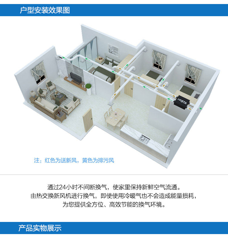 高能效比:采用水平進排風,具非常高的能效比,可回收70%以上能量 高效過濾:采用歐洲標準H13級過濾,多重過濾;PM2.5過濾99%以上 雙向流新風機:訂機采用雙核動力設計,動力強,體積?。徊捎弥绷鳠o刷電機,低噪音,低能耗